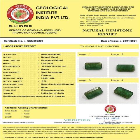 2.55 Carat 3 Ratti Natural GII Certified Zambian Octagonal shape Green Emerald Gemstone