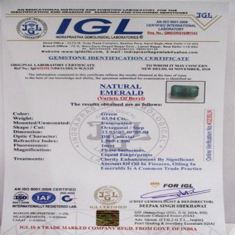 3.94 Carat 4.33 Ratti Natural IGL Certified Zambian Octagonal shape Green Emerald Gemstone