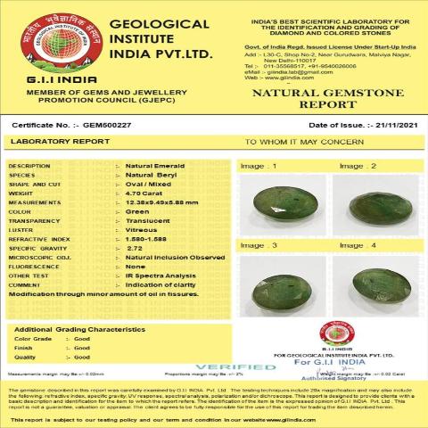 4.7 Carat 5.25 Ratti Natural GII Certified Zambian Oval shape Green Emerald Gemstone