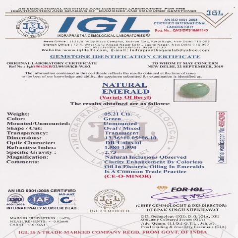 5.21 carat 5.73 ratti IGL certified natural Zambian Oval shape Emerald stone