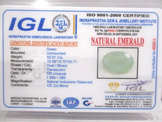 5.97 Carat 6.57 Ratti Natural IGL Certified Colombian Oval shape Green Emerald Gemstone