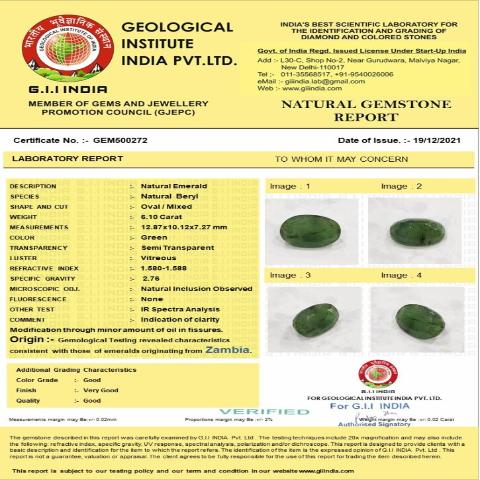 6.1 Carat 6.71 Ratti Natural GII Certified Zambian oval shape Green Emerald Gemstone
