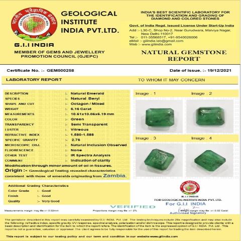 6.16 Carat 7 Ratti Natural GII Certified Zambian Octagonal shape Green Emerald Gemstone