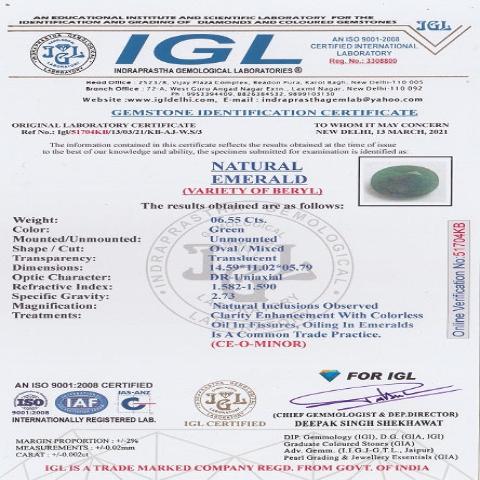 6.55 Carat 7.21 Ratti Natural IGL Certified Zambian Oval shape Green Emerald Gemstone