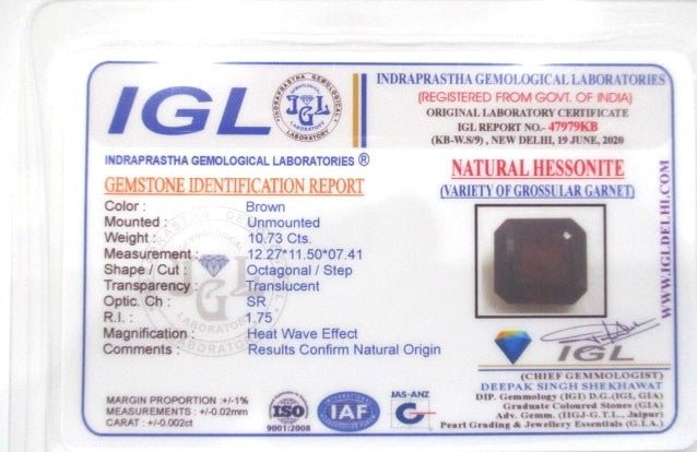 10.73 Carat 12 Ratti IGL Certified Natural Ceylon (Sri Lanka) Octagonal shape Hessonite (Gomed) Gemstone