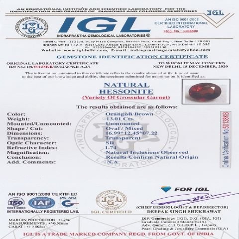 13.01 Carat 14.31 Ratti IGL Certified Natural African Hessonite (Gomed) Gemstone