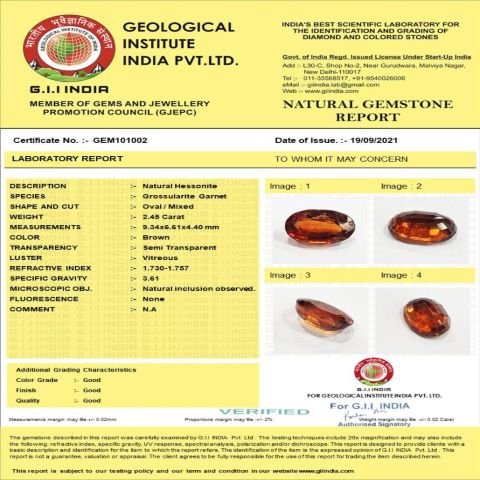 2.45 Carat (2.7 Ratti) IGL Certified Natural Ceylon (Sri Lanka) Hessonite (Gomed) Gemstone
