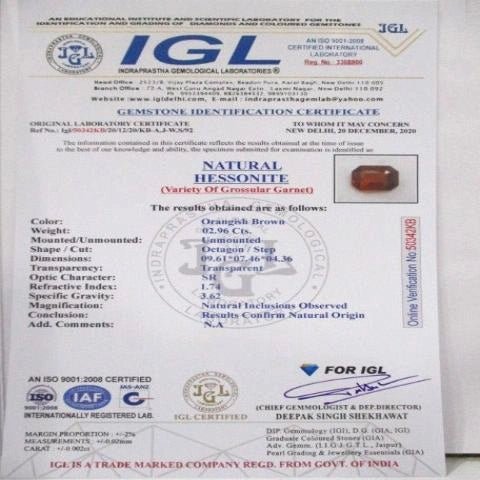 2.96 carat 3.26 ratti IGL certified natural ceylon(sri lanka) octagoanl shape hessonite(gomed) stone