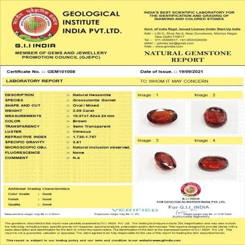 3.05 Carat (3.36 Ratti) IGL Certified Natural Ceylon (Sri Lanka) Hessonite (Gomed) Gemstone