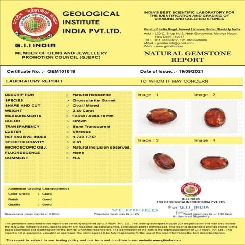 3.6 Carat (4 Ratti) IGL Certified Natural Ceylon (Sri Lanka) Hessonite (Gomed) Gemstone