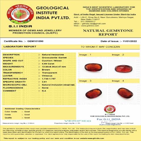 4.55 Carat 5.01 Ratti GII Certified Natural Ceylon (Sri Lanka) Cushion shape Hessonite (Gomed) Gemstone