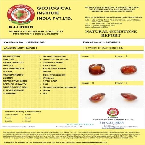 4.65 Carat (5.25 Ratti) IGL Certified Natural Ceylon (Sri Lanka) Hessonite (Gomed) Gemstone