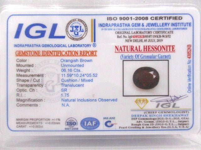 6.16 Carat 7 Ratti IGL Certified Natural Ceylon (Sri Lanka) Cushion shape Hessonite (Gomed) Gemstone