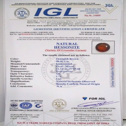6.82 Carat (7.5 Ratti) IGL Certified Natural African Hessonite (Gomed) Gemstone