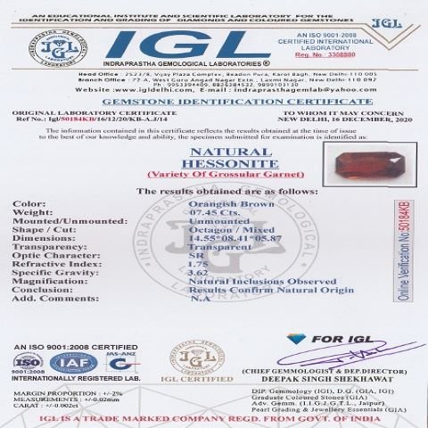 7.45 Carat (8.25 Ratti) IGL Certified Natural African Hessonite (Gomed) Gemstone