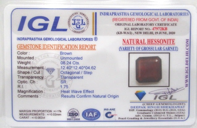 8.24 Carat 9.25 Ratti IGL Certified Natural Ceylon (Sri Lanka) Octogonal shape Hessonite (Gomed) Gemstone
