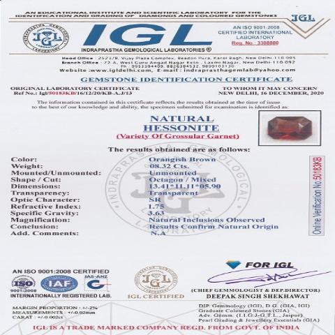 8.32 carat 9.25 ratti IGL certified natural ceylon(sri lanka) octagonal shape hessonite(gomed) stone
