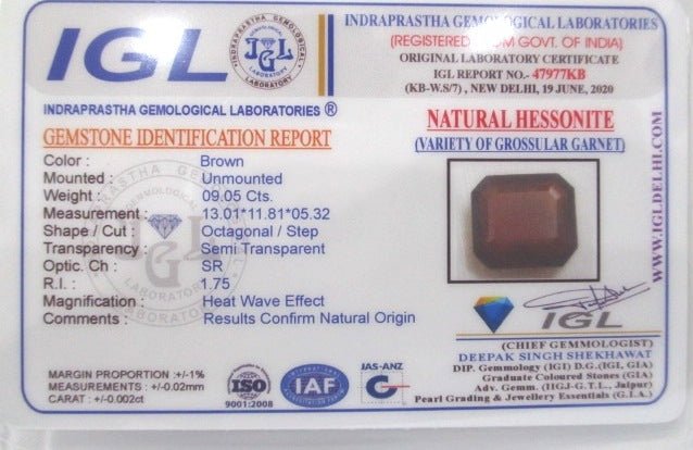 9.05 Carat 10 Ratti IGL Certified Natural Ceylon (Sri Lanka) Octagonal shape Hessonite (Gomed) Gemstone