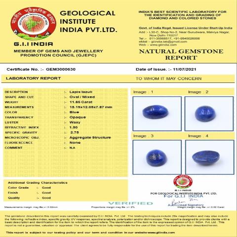 11.65 Carat 13 Ratti Natural GII Certified Africa Oval shape Blue Lapis lazuli Gemstone