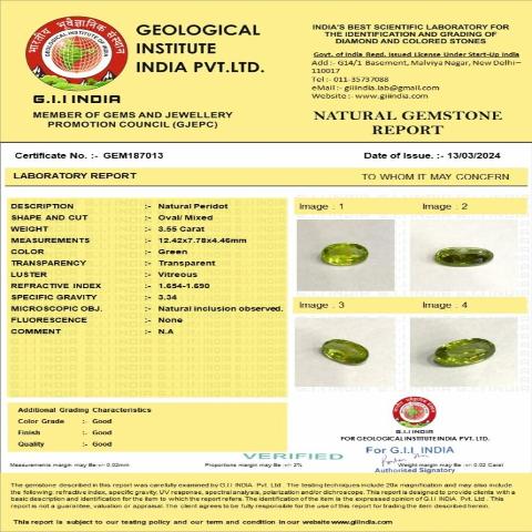 3.55 carat 4 ratti GII certified natural American oval green peridot stone