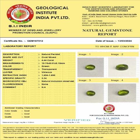 4.44 carat 5 ratti GII certified natural American oval green peridot stone