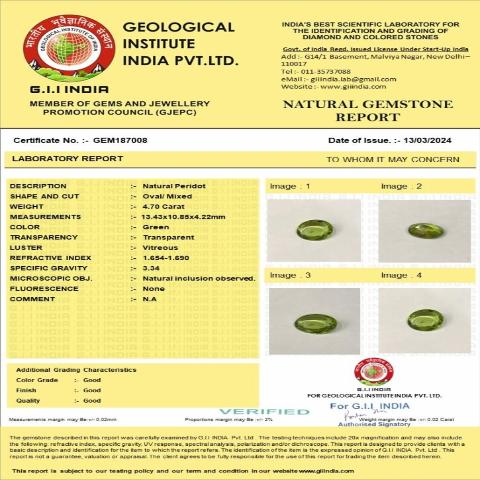 4.7 carat 5.25 ratti GII certified natural American oval green peridot stone