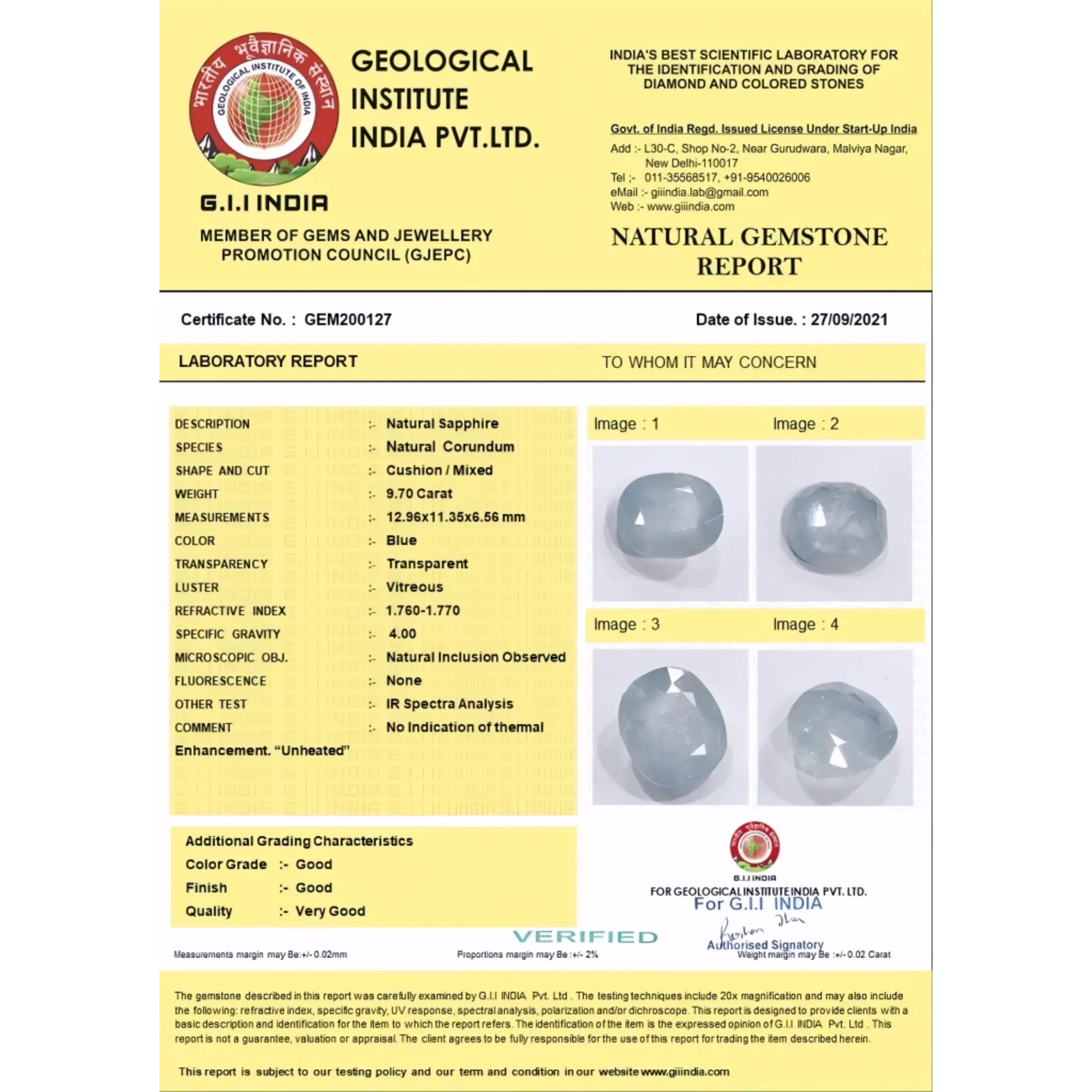 Ceylon Pitambari Unheated & Untreated 9.7 carat Cushion Shape Certified