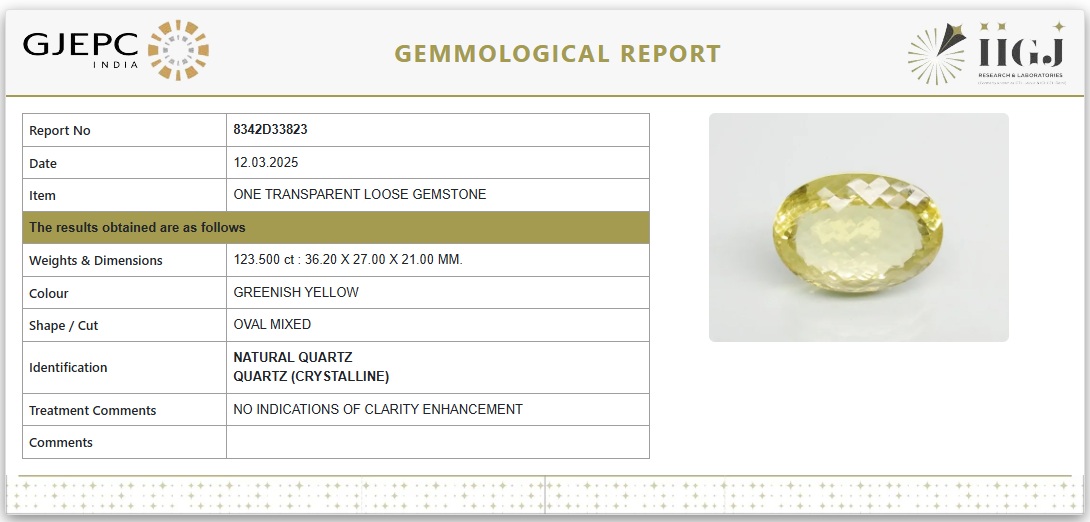 123.5 Carat 136 Ratti GII Certified Natural Brazil Oval Greenish Yellow Quartz Stone