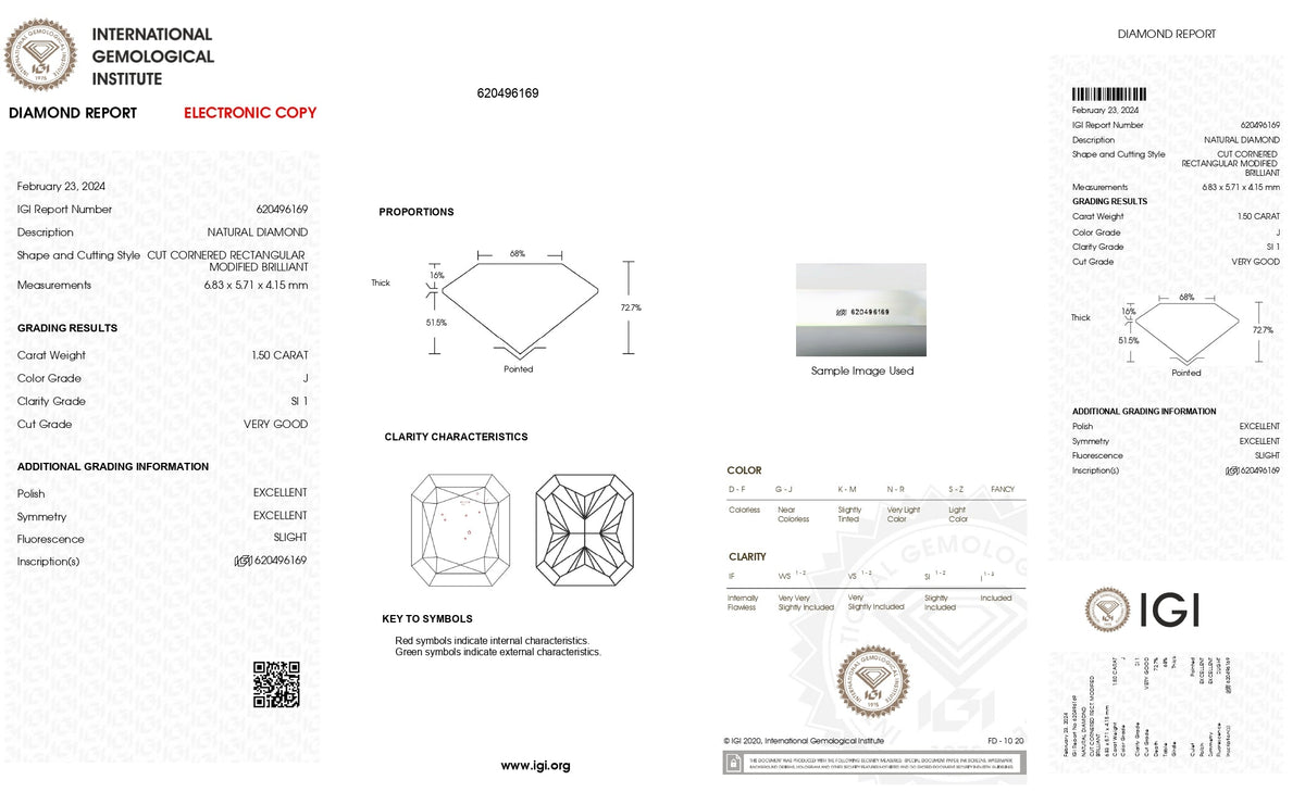 Weighing 1.50ct, this radiant brilliant cut diamond features a combination of linear and circular facets that maximize light reflection. As a result, it creates an eye-catching brilliance and fiery sparkle from every angle.