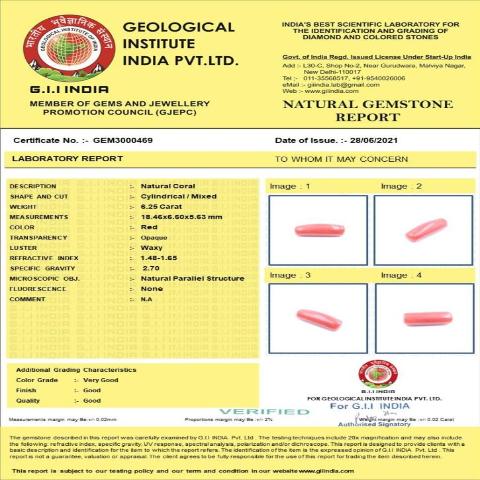 6.25 carat 7 ratti GII certified natural Italian cylindrical shape red coral stone