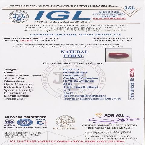 6.38 carat 7.02 ratti IGL certified natural Italian cylindrical shape red coral stone