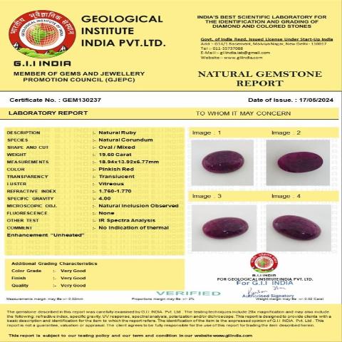 19.6 carat 21.56 ratti GII certified natural Kazakhstan oval shape Pinkish-red ruby stone