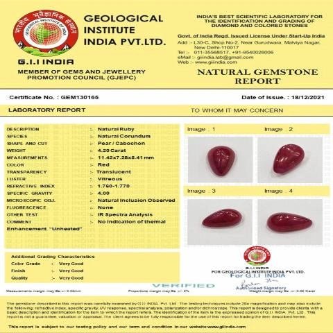 4.2 Carat 4.62 Ratti GII certified Natural khazakhstan pear shape Red Ruby Gemstone