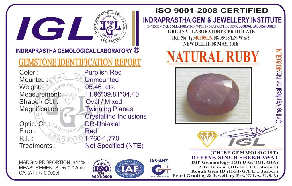 5.46 Carat 6.01 Ratti IGL certified Natural Africa Oval shape Purplish-red Ruby Gemstone