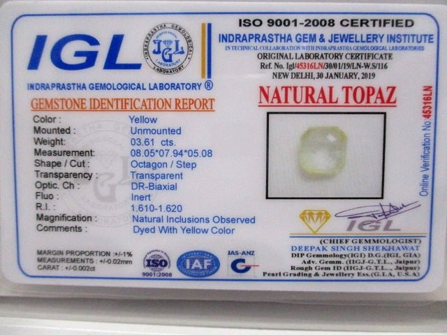 3.61 carat 4 ratti IGL certified natural Indian octangle shape yellow topaz stone