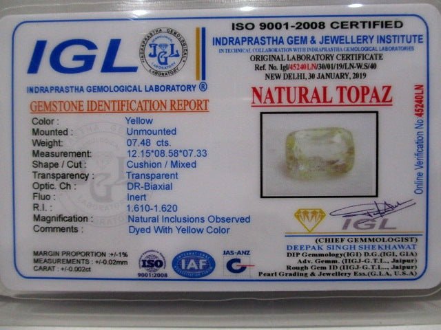 7.48 carat 8.23 ratti natural IGL certified Indian cushion shape yellow topaz stone