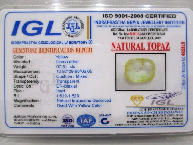7.81 carat 8.59 ratti natural IGL certified Indian cushion shape yellow topaz stone