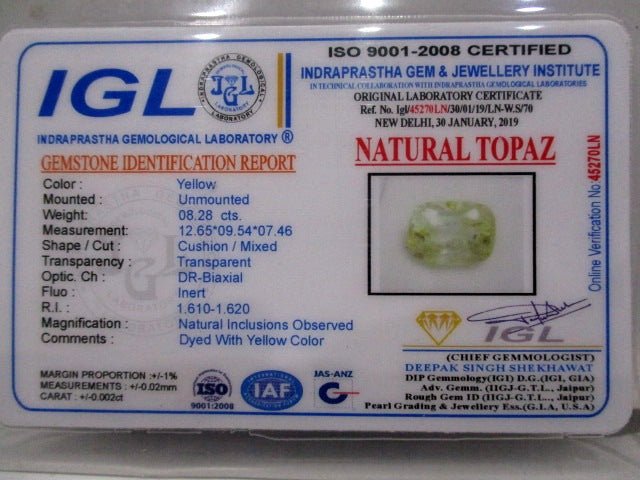 8.28 carat 9.25 ratti natural IGL certified Indian cushion shape yellow topaz stone
