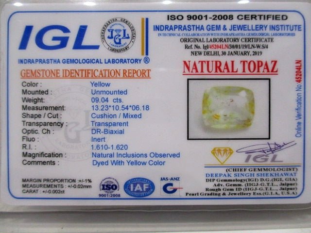 9.04 carat 10 ratti natural IGL certified Indian cushion shape yellow topaz stone