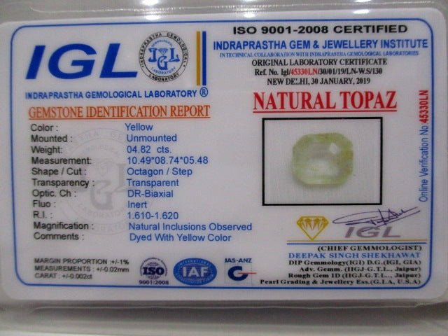 4.82 carat 5.3 ratti natural IGL certified Indian Octagon shape yellow topaz stone