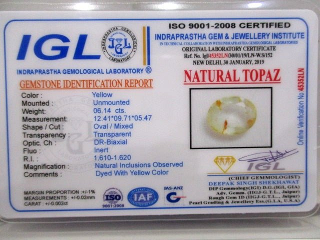 6.14 carat 7 ratti natural IGL certified Indian Oval shape yellow topaz stone