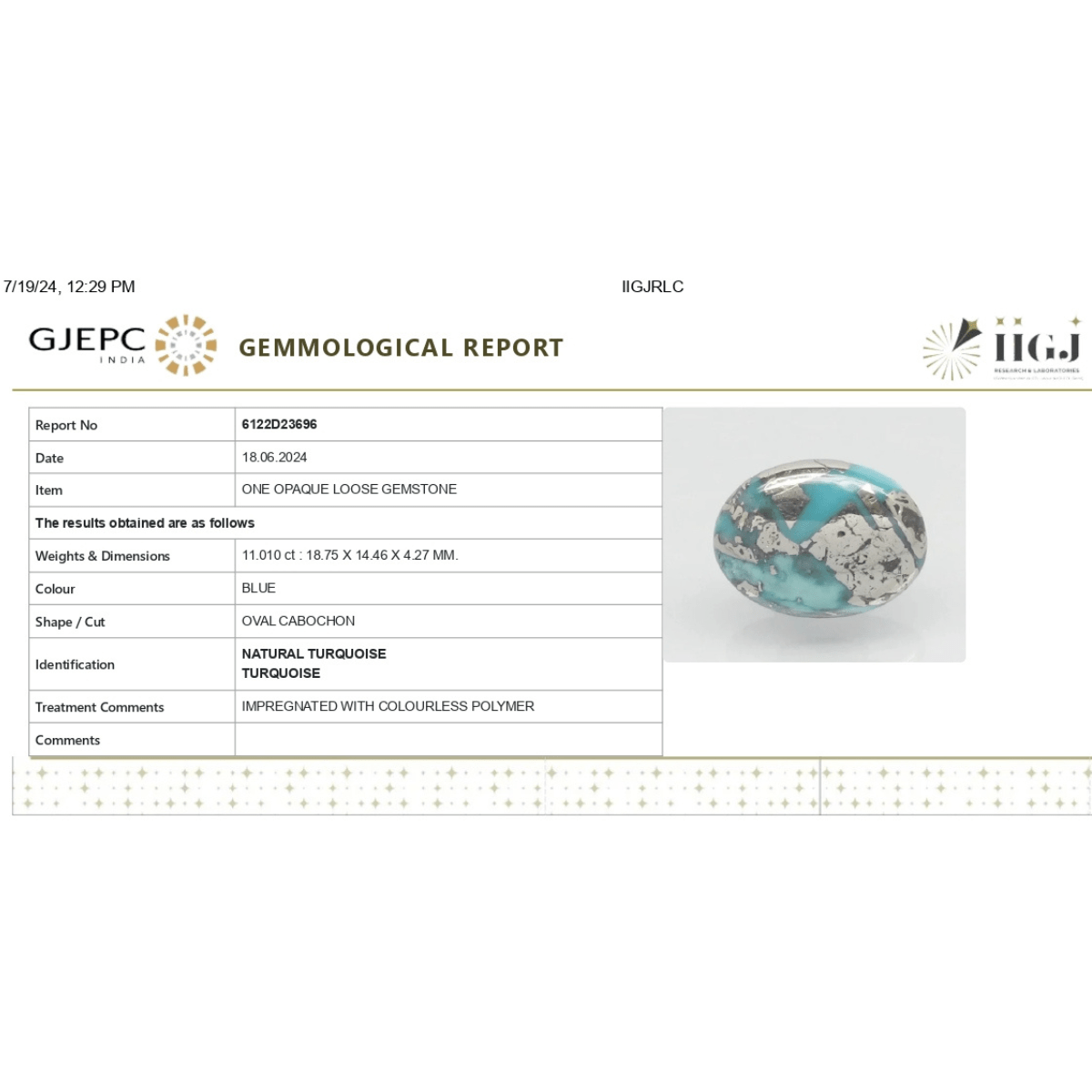 11.01 carat 12.25 ratti IGI-GTL certified AAA+ Quality Blue with golden Bisbee Oval Turquoise (Firoza) Stone