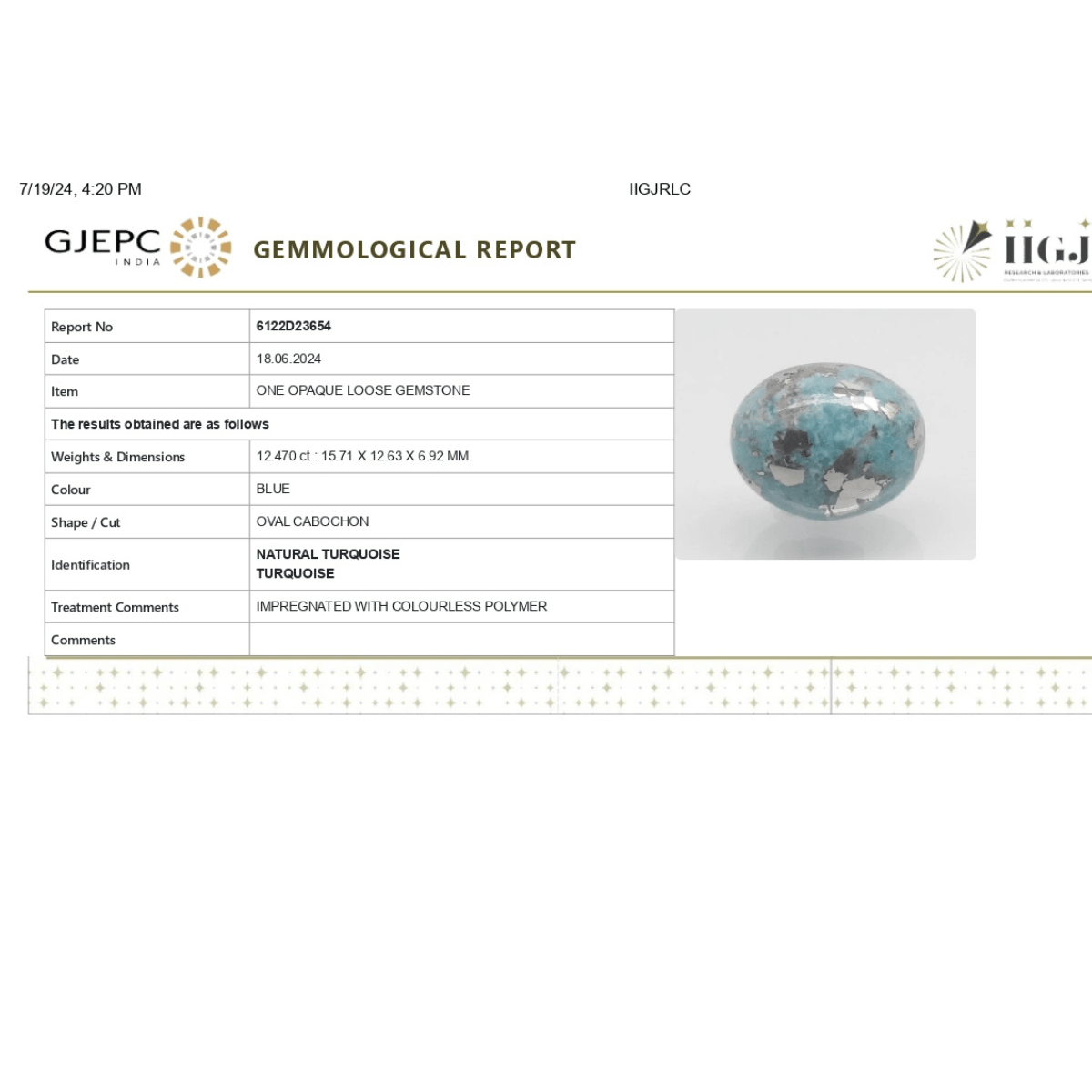 12.47 carat 13.72 ratti IGI-GTL certified AAA+ Quality Blue with golden Bisbee oval Turquoise (Firoza) Stone