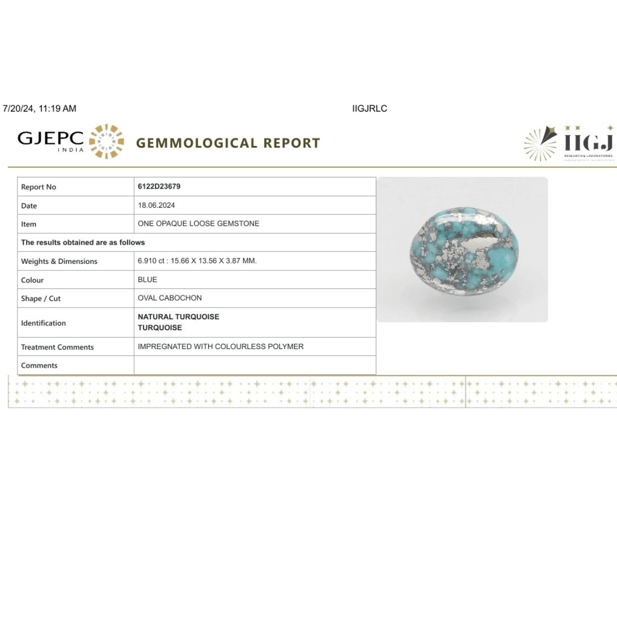 6.91 carat 7.6 ratti IGI-GTL certified AAA+ Quality Blue with golden Bisbee oval Turquoise (Firoza) Stone