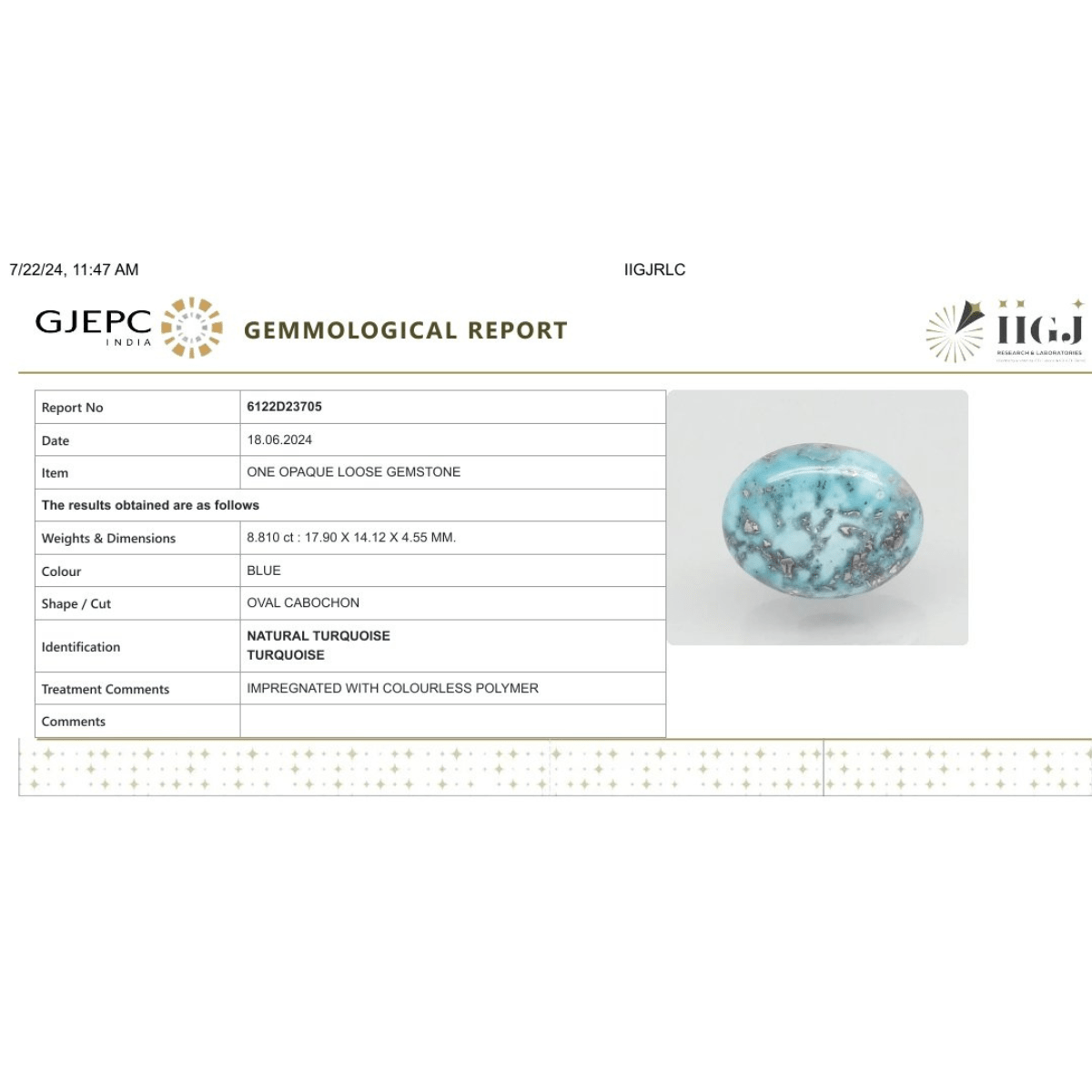 8.81 carat 9.69 ratti IGI-GTL certified AAA+ Quality Blue with golden Bisbee oval Turquoise (Firoza) Stone