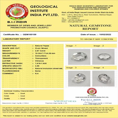 2.87 carat 3.25 ratti GII certified natural Indian oval shape white topaz stone