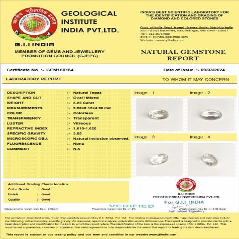 3.25 carat3.58 ratti GII certified natural Indian Oval shape white topaz stone