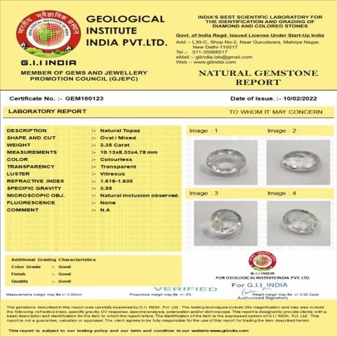 3.35 carat 3.69 ratti GII certified natural Indian oval shape white topaz stone