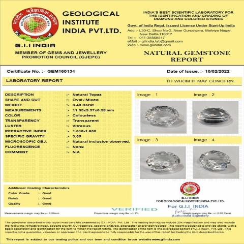 6.4 carat 7.04 ratti GII certified natural Indian oval shape white topaz stone