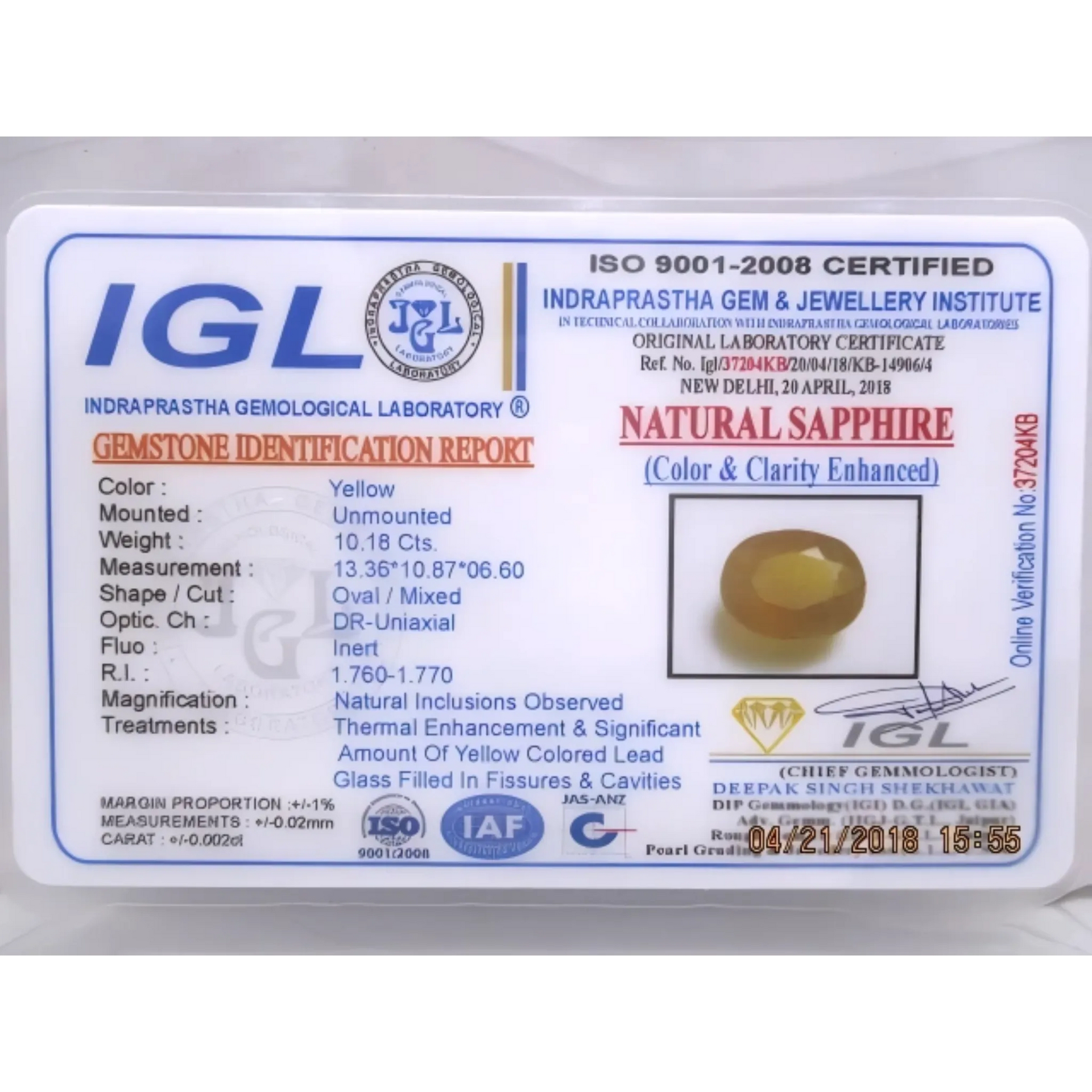 10.18ct Certified Bangkok Yellow Sapphire – Heat Treated – Brilliant Natural Beauty